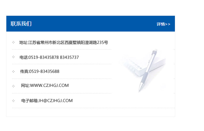 傳真:0519-83435688    郵編:213135    網址:WWW.czjhgj_com.cadike.com    電子郵箱:JH@czjhgj_com.cadike.com